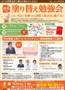 塗装業界では未だに、不良施工などのトラブルの発生が問題になっています。本勉強会では一般財団法人塗装品質機構(PQA)が推奨する工事品質を確保するための「塗装工事の依頼方法」や「塗装工事の基準」「信頼できる塗装工事会社の選び方」など、優良住宅塗装工事研究会会員の私たちが、分かりやすく解説します。 |