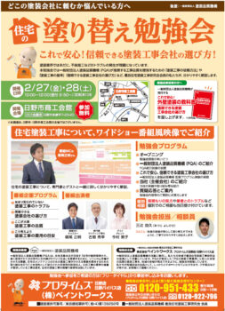 塗装業界では未だに、不良施工などのトラブルの発生が問題になっています。本勉強会では一般財団法人塗装品質機構(PQA)が推奨する工事品質を確保するための「塗装工事の依頼方法」や「塗装工事の基準」「信頼できる塗装工事会社の選び方」など、優良住宅塗装工事研究会会員の私たちが、分かりやすく解説します。 |